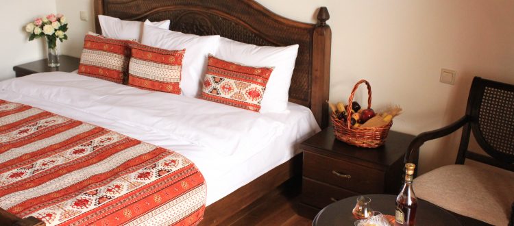 Lokalisiert auf dem dritten Stock, EINE SUITE, die Raumgröße ist 24 Quadratmeter, ein schöner Balkon mit der Ansicht auf den Obstgarten und den Poolbereich, handgefertigte Garderobe aus Holz mit Kleiderbügeln, schönes, handgefertigtes Bett aus Holz mit eingelegter ornamentalen Gestaltung, Nachttische, zwei Sessel mit einem runden Couchtisch, natürliche Baumwollbettwäsche, komfortable orthopädische Matratzen, Tüllgardinen der Handarbeit mit schönen Blumenmustern an den Türen, ein Bad en Suite mit Jacuzzi, kostenlose Toilettenartikel, Holzdecke, Holzfußboden, kleine ornametale Teppiche aus natürlicher Wolle.