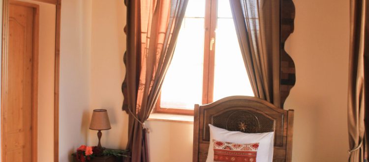Lokalisiert auf dem ersten Stock, EINZELBETT umbaubar zum DOPPELBETT; die Raumgröße ist 16 Quadratmeter mit der Ansicht aud den Obstgarten, handgefertigte Garderobe aus Holz mit Kleiderbügeln, handgefertigte Betten aus Holz mit Retro-Design,Nachttische, natürliche Baumwollbettwäsche, komfortable orthopädische Matratzen, schöne Tüllgardinen der Handarbeit an den Fenstern, ein Bad en Suite mit Badewanne, kostenlose Toilettenartikel, Holzdecke, Holzfußboden, gewebte kleine Teppiche aus natürlicher Wolle.
